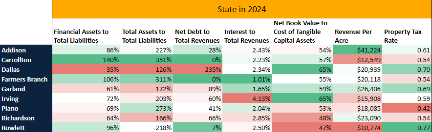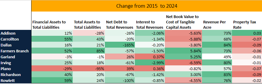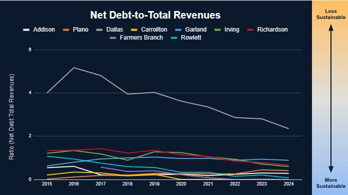The result? The City of Dallas is in massive debt but improving rapidly, Carrollton and Farmers Branch appear to be in a great spot, and Plano is the only city in this group to get worse over the time period.