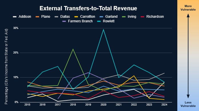 This shows the share of the city’s income that comes from state or federal aid. It can also include one-time payments from developers for infrastructure like roads or utilities in a new development. High dependency on outside funding makes the city vulnerable to political or economic shifts beyond its control.